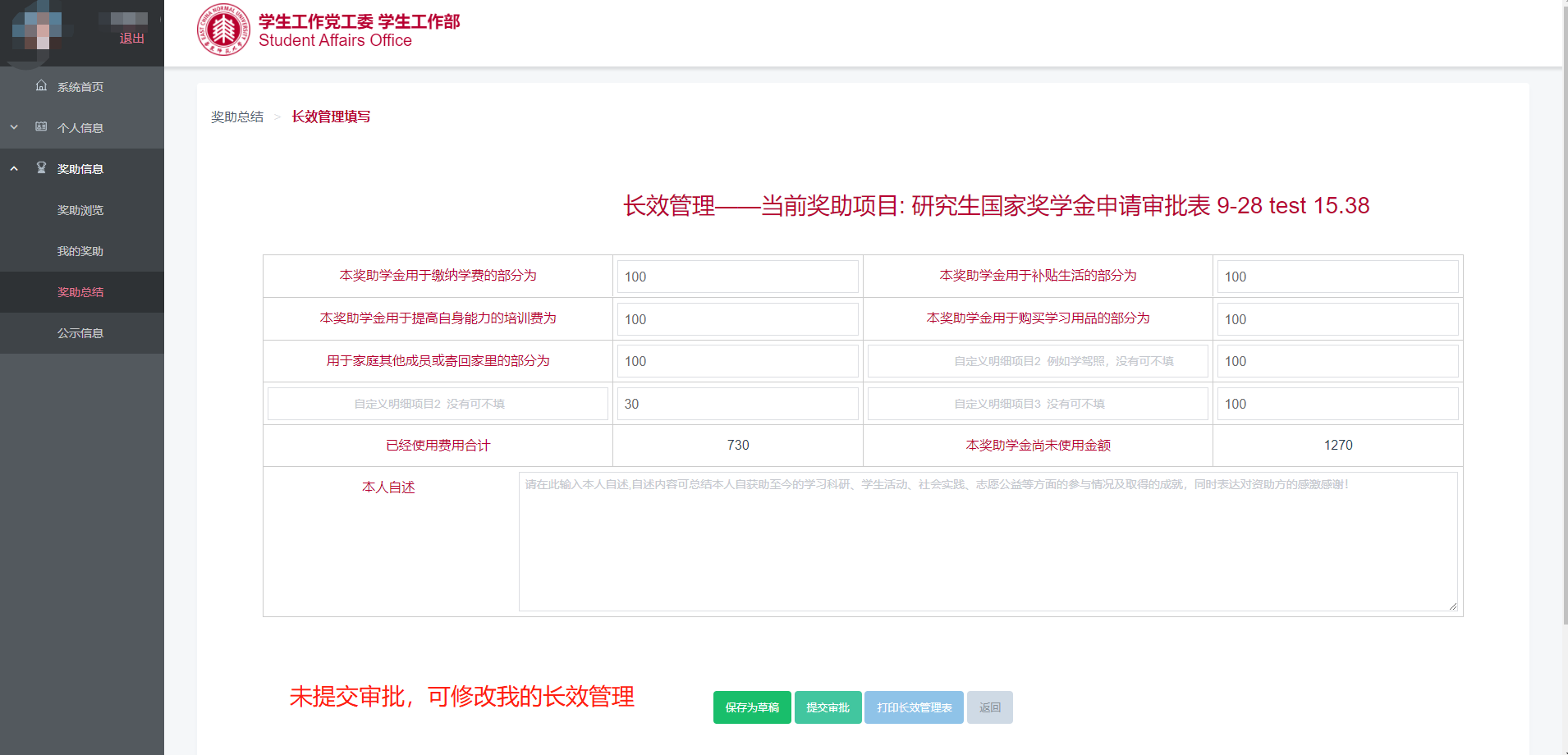 点击对应条目的“修改我的长效管理”可以进行编辑,未填写完的长效管理可以点击文档底部的“保存草稿”按钮保存(图4.2),下次登陆时可以回到“我的奖助”页面中打开草稿继续填写。长效管理提交审批后,除被退回,无法进行修改。
