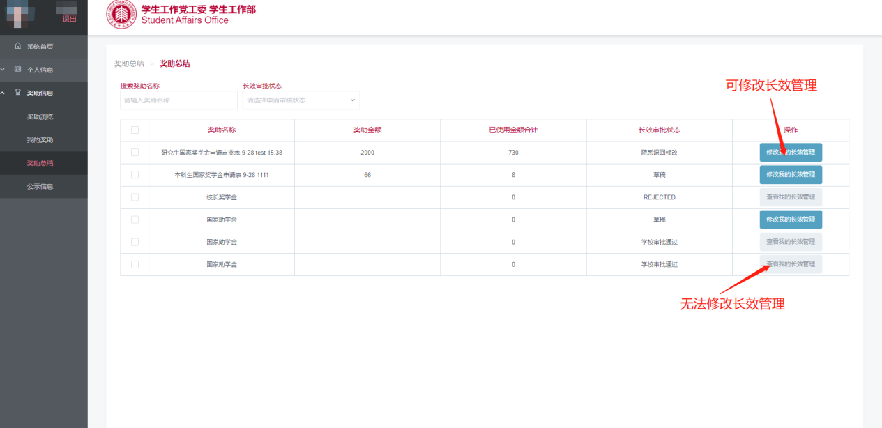 在左侧“奖助信息”一栏中,点击“奖助总结”,可以查看需要长效管理的奖助学金(图4.1)。