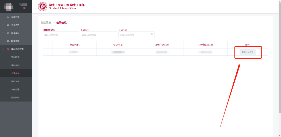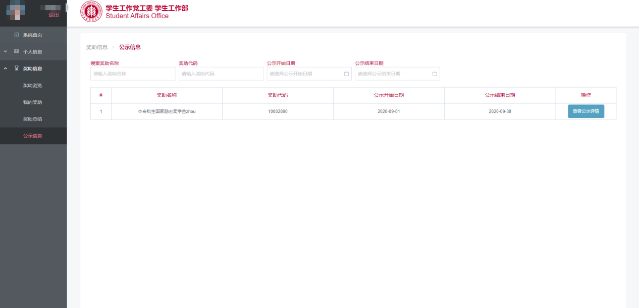 在左侧“奖助信息管理”一栏中,点击“公示信息”进入页面,列表中展示了所有正在公示的奖助信息(图4.1)。