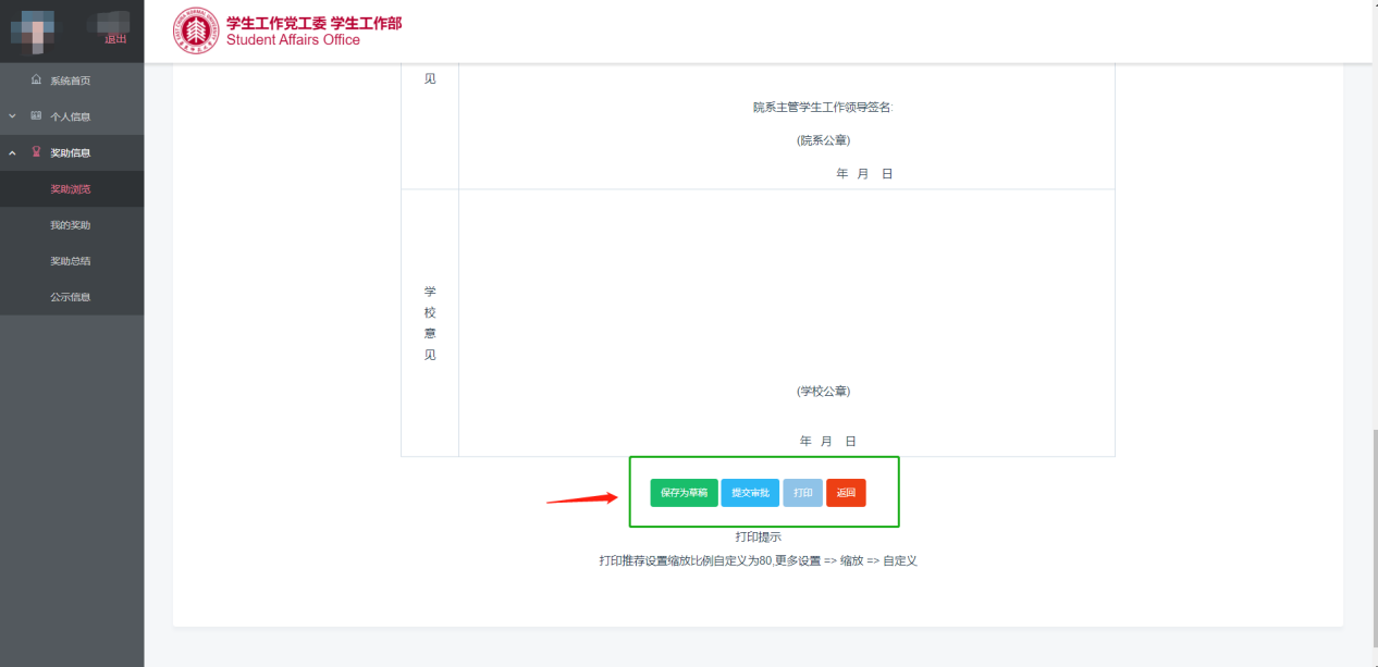 填写完毕后,点击文档底部的“提交审批”提交申请表格(图2.4)。提交申请后,除被退回,无法进行修改。提交成功后网页会自动跳转到“我的奖助”界面。