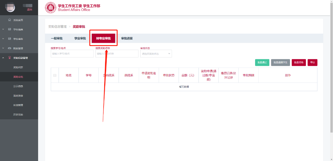 点击“转专业审批”标签即可查看学生的转专业申请,审批操作和一般审批相同(图3.9)。