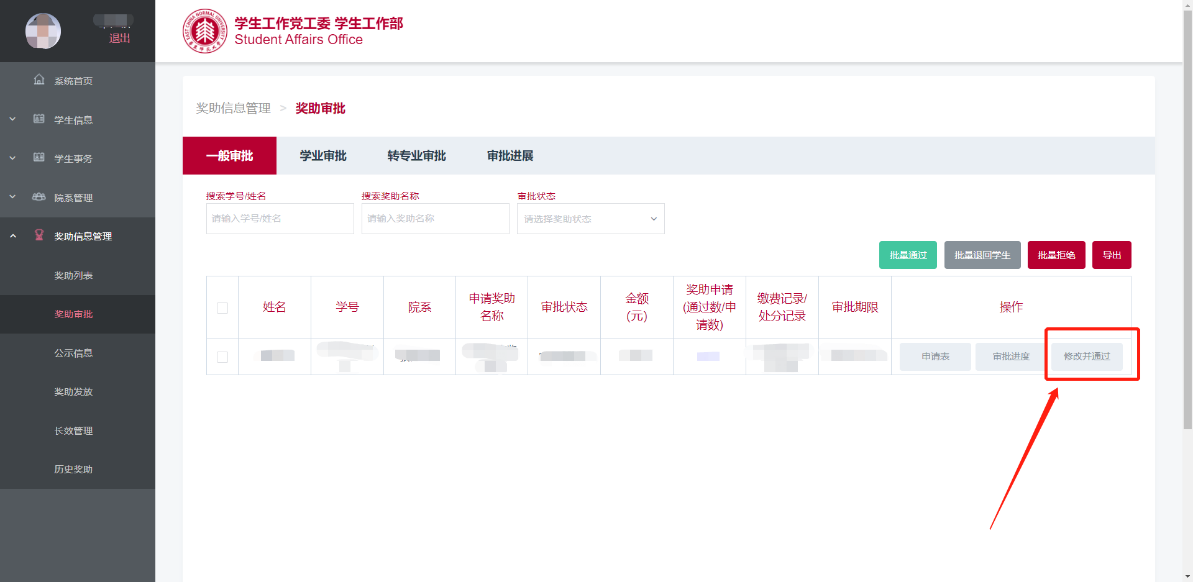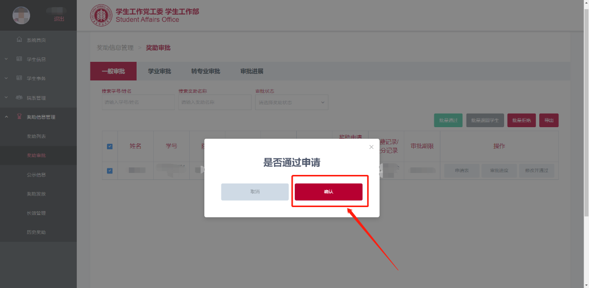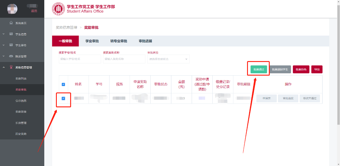 管理员可通过“批量通过”、“批量退回学生”、“批量拒绝”来对选中的一个或多个奖助申请进行操作,以“批量通过”为例,具体步骤如下: