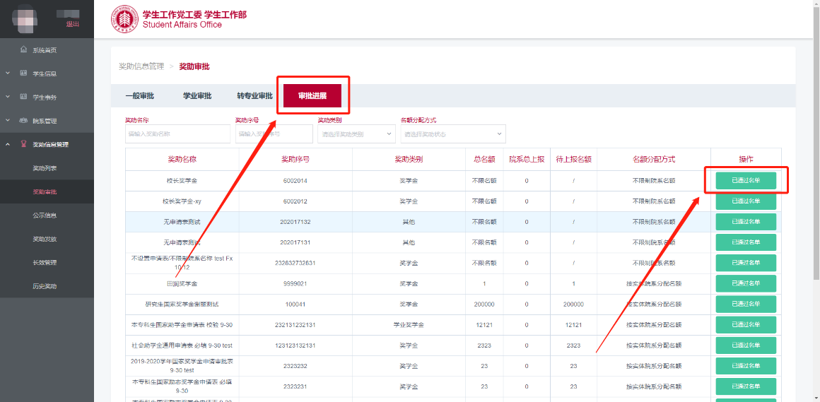 点击“审批进展”标签即可查看各奖助的审批进展情况,点击“已通过名单”可查看该奖助已经通过申请的学生名单(图3.10)。