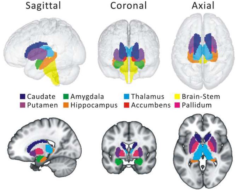 本研究根据视觉发散性思维测试分数选择了高水平组(HCG, n = 22)和低水平组(LCG, n = 22)受试者,收集了其静息态fMRIr-fMRI)数据。之后根据r-fMRI数据计算了动态功能连接矩阵、全脑网络的拓扑属性和皮下脑区(见图1)的拓扑参数,基于动态功能连接和图论分析探讨了皮下区域与视觉发散性思维之间的关系。
