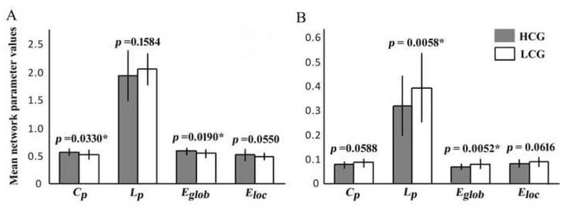 3. A. 高低水平组的皮下网络全局参数差异比较结果;B. 高低水平组的皮下网络全局参数的变异性的差异比较结果。* p < 0.05