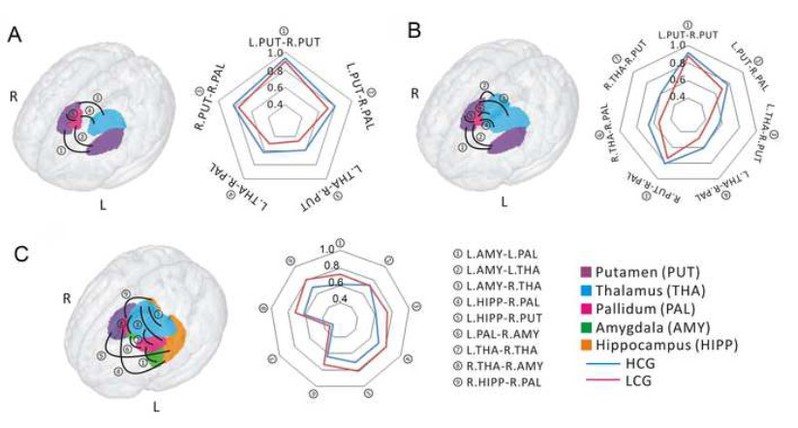 结果发现,双侧壳核、右侧苍白球与双侧壳核、左侧丘脑与右侧壳核/苍白球之间的功能连接显示出显著的组间差异。动态功能连接变异性的结果发现,HCGLCG在壳核、丘脑、苍白球、杏仁核和海马之间存在显著差异,且HCG的皮下网络变异性指标更小,说明HCG的皮下网络稳定性更高(见图2)。 图论结果也发现,HCGLCG的皮下网络的信息传递效率更高(见图3),这表明高水平组的皮下网络比低水平组的网络效率更优化。