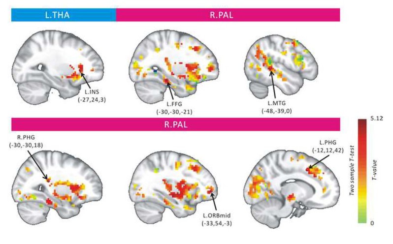 4. 皮下脑区-大脑皮层的功能连接的两组比较结果