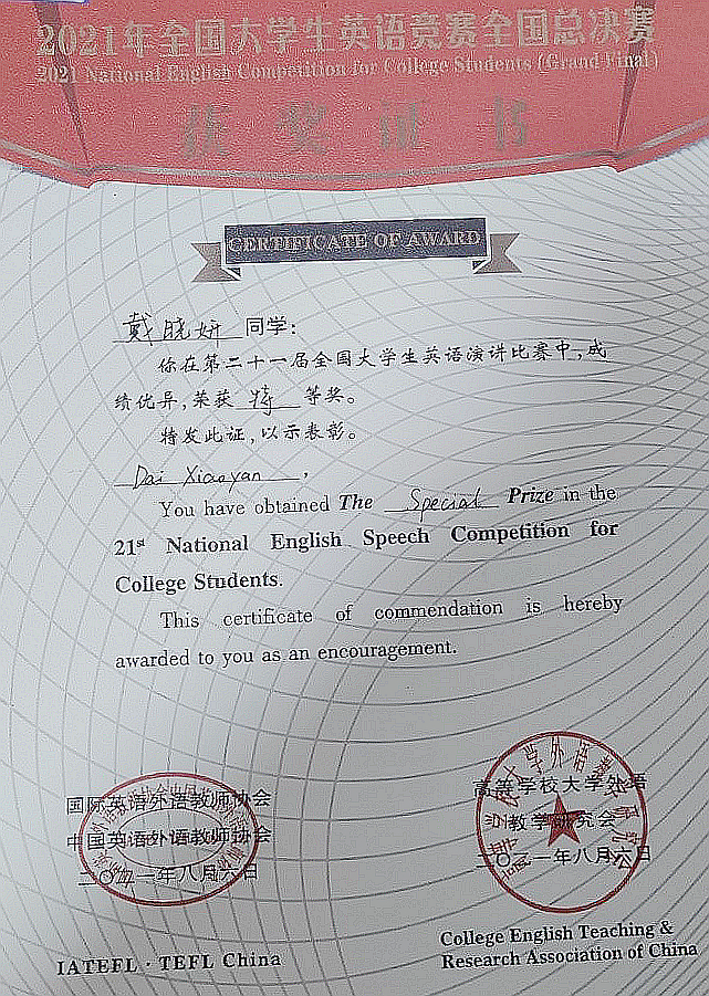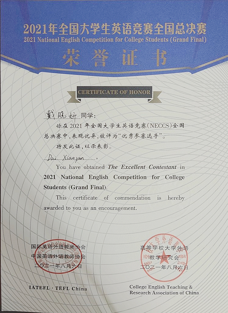 2021年8月2日至8月7日,必赢2017级本科生戴晓妍参加全国大学生英语竞赛全国总决赛,在第二十一届全国大学生英语演讲比赛中喜获特等奖,并获得“优秀参赛选手”的称号。