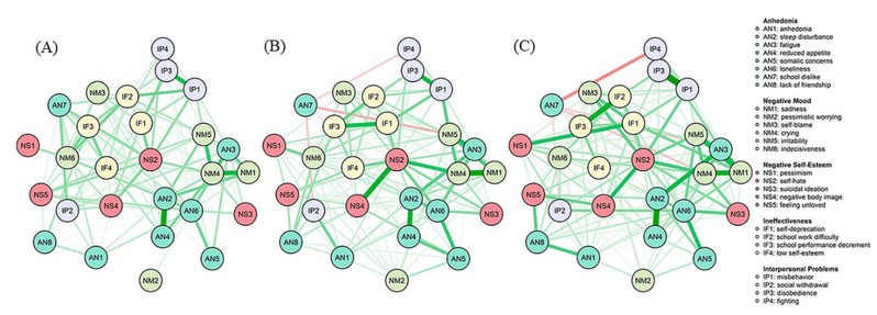 在症状中心性方面,自我厌恶、孤独和睡眠障碍是儿童青少年抑郁的核心症状,并且在三个时间点上具有稳定的中心性;而哭泣和自我贬低在中心性方面具有较大的跨时间异质性。在症状联结方面,睡眠障碍和食欲下降、悲伤和哭泣、不当行为和不服从可能是灾后儿童和青少年抑郁症状易固着化的重要症状关联。总体来看,不同时期抑郁网络的中心症状相似和重要症状关联相同可能是灾后抑郁症稳定发展且易固着化的原因之一。未来研究和灾后心理援助工作可以进一步探究将自我厌恶、孤独和睡眠障碍作为干预靶点是否可以加速灾后儿童青少年抑郁症的康复。