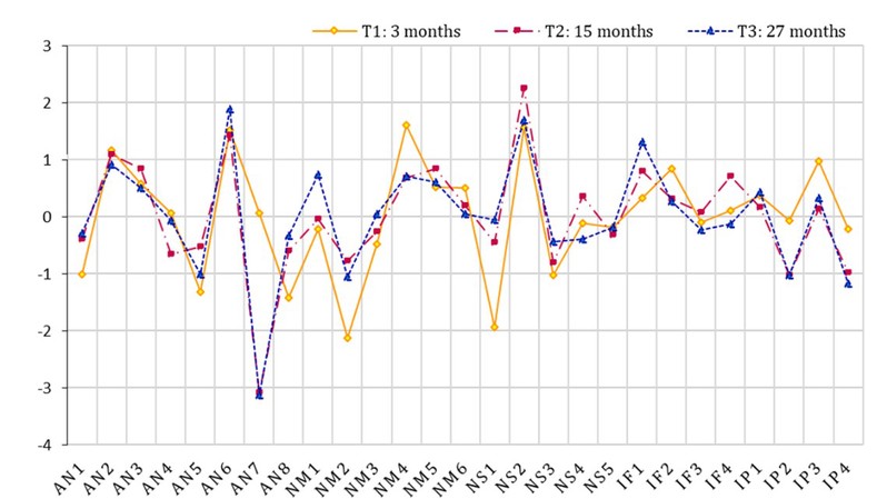 研究团队采用Ising模型来估计每个研究时点的抑郁症状网络,并使用预期影响来评估节点中心性,其次使用网络比较检验来考查三个时间点之间网络指标的稳定性。各时间点抑郁症状网络的结构如图1所示,各抑郁症状的中心性如图2所示。研究结果显示,在灾后儿童青少年群体中,抑郁症状网络具有较高的跨时间的稳定性,具体表现在具有相似的核心症状和症状联结。