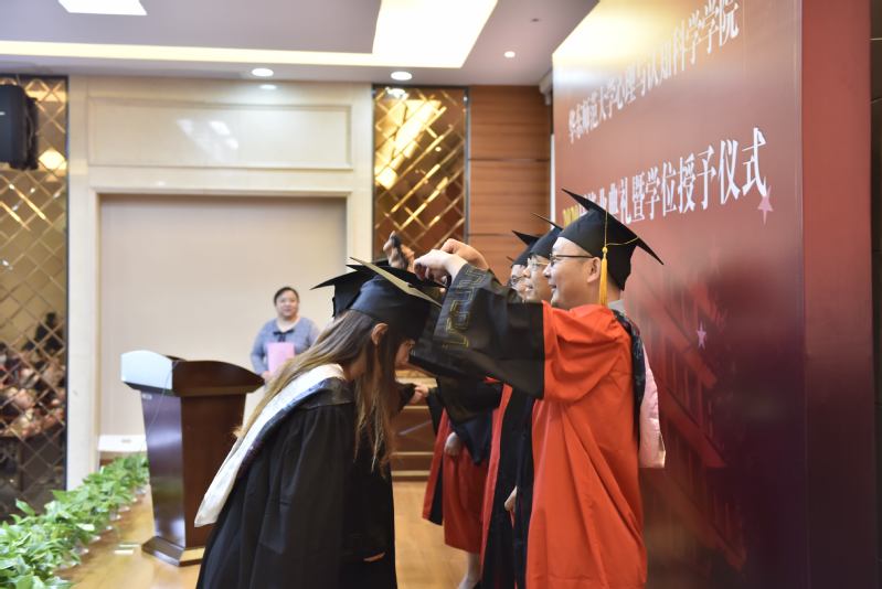 在隆重的学位授予仪式上,院学位分委员会、MAP学位评定小组成员代表为在场的毕业生拨穗。