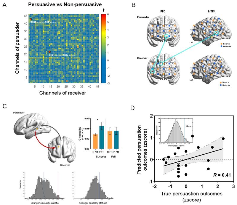 图2. (A&B)脑-脑耦合在说服成功和失败条件下显著差异示意图。(C)格兰杰因果分析。(D)脑-脑耦合有效预测说服结果。