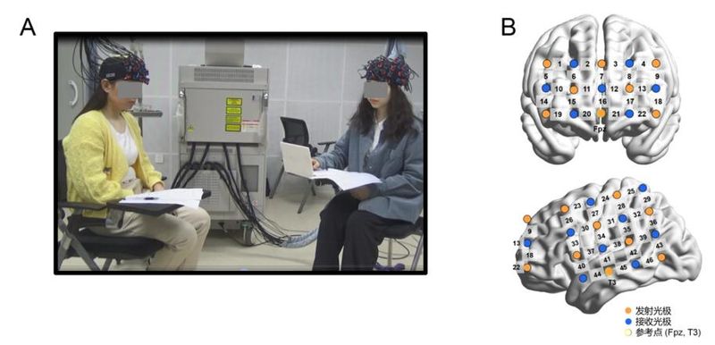 图1. (A)实验场景例图;(B)观测脑区。