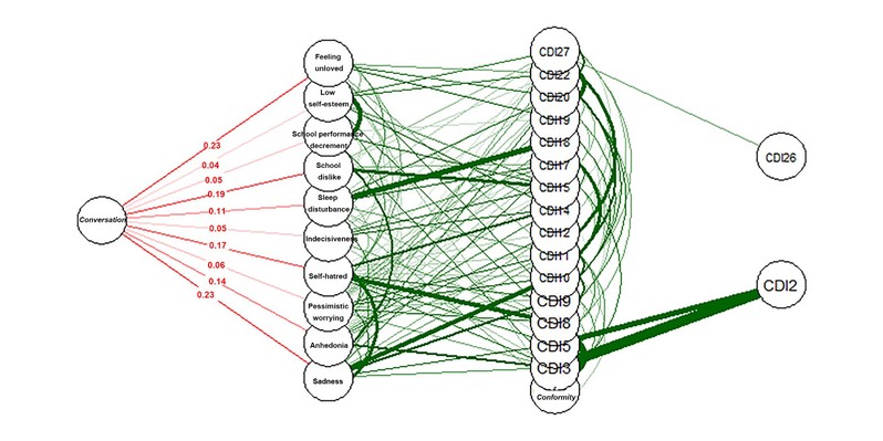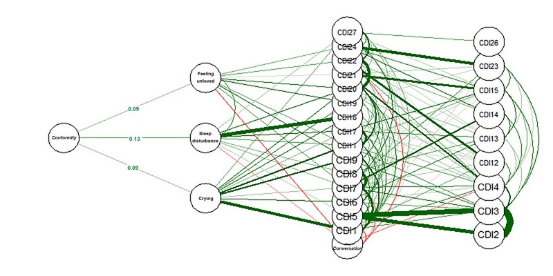 采用网络分析进一步探究受家庭沟通方式影响的具体症状,结果发现开明平等的沟通能让青少年拥有更高的自尊、更好的学业表现和更少的低落情绪(图1,图中红色的线表示负相关,绿色的线表示正相关),而父母的过度控制则与睡眠紊乱以及更频繁的哭泣相关(图2)。值得注意的是,两种沟通方式都与青少年当下是否感受到被爱有关,且“缺爱的感觉”(feeling unloved)是唯一一个能同时被两种家庭沟通方式有效预测的抑郁症状,提示其可能是连接家庭沟通与青少年抑郁的桥梁。换句话说,父母自以为是的“我这么做都是为你好”,很多时候并不能传递爱与温暖,相反可能带来压抑、焦虑和自我怀疑。而只有赋予青少年更多的自主权、尊重孩子的合理诉求、平等开明地进行沟通,才能创造爱的氛围,保护他们远离抑郁。