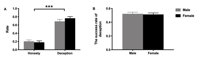 2. 行为结果。(A)不同性别下的诚实率和欺骗率;(B)不同性别下的成功欺骗率。