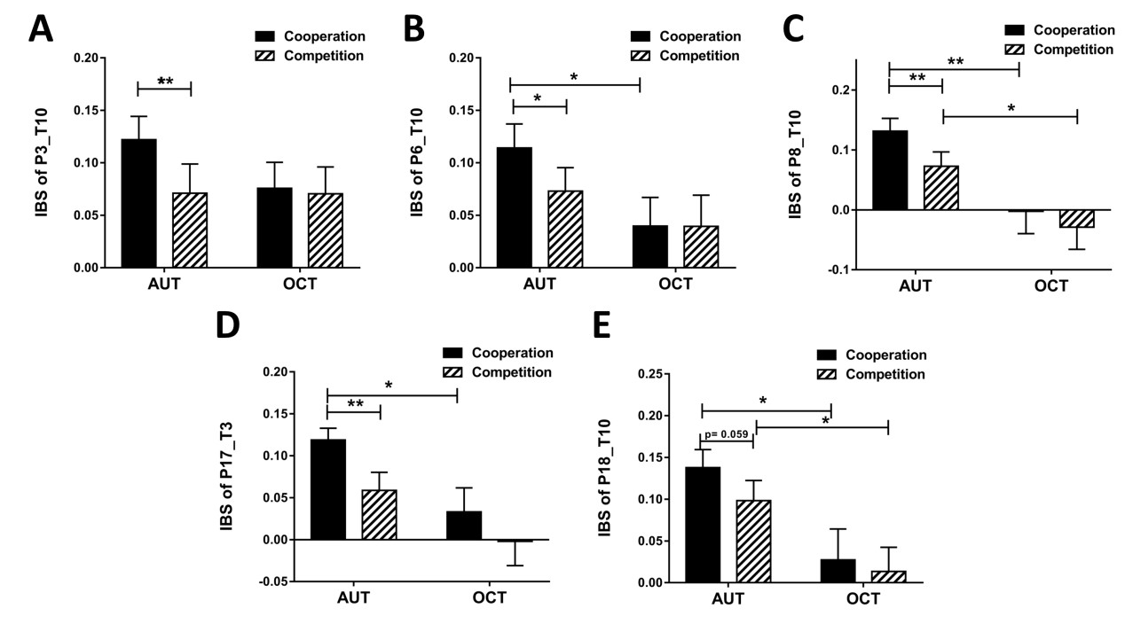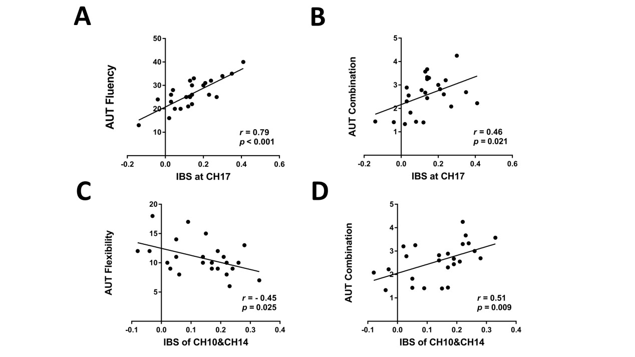 行为结果表明,无论是在AUT还是OCT任务上,合作条件下的两人小组均有更优的表现(见图2)。此外,在AUT上,合作模式条件下的两人小组表现出更高水平的合作行为(他们更倾向于在对方的观点上建构自己的新观点)。fNIRS结果显示,“AUT&合作”条件下的两人小组在右侧背外侧前额叶(r-DLPFC)和右侧颞顶联合区(r-TPJ)的IBS相对于基线有显著提升(见图3, 图4)。在r-DLPFC和r-TPJ上,“AUT&合作”条件下的IBS均显著高于其他条件下的IBS(见图3, 图4),然而,“OCT&合作”和“OCT&竞争”两条件下的IBS间不存在显著差异,这在一定程度上表明,该IBS特异于创造力任务。此外,在“AUT&合作”条件下,以上两个脑区的IBS与团队内部的合作行为水平存在正相关(见图5),在r-DLPFC上的IBS与团队创造力表现存在正相关(见图5)。同时,在“AUT&合作”条件下,我们还发现个体间不同脑区间的IBS也表现出了显著提升,且其条件间差异与上述相同脑区IBS结果模式非常类似(见图6)。近年来的研究表明,IBS可以作为个体间进行合作性互动、信息交流的一种神经指标(Baker et al., 2016; Cui et al., 2012; Jiang et al. 2012; Liu et al. 2017; Nozawa et al. 2016; Pan et al., 2017)。在本研究中,“AUT&合作”条件下的IBS与团队内部的合作行为水平表现出正相关。据此,上述结果可能表明合作的互动模式能够促进团队内部的人际互动以及信息交流,从而使得团队内部资源得到充分利用,并促进其团队的整体创造表现。
