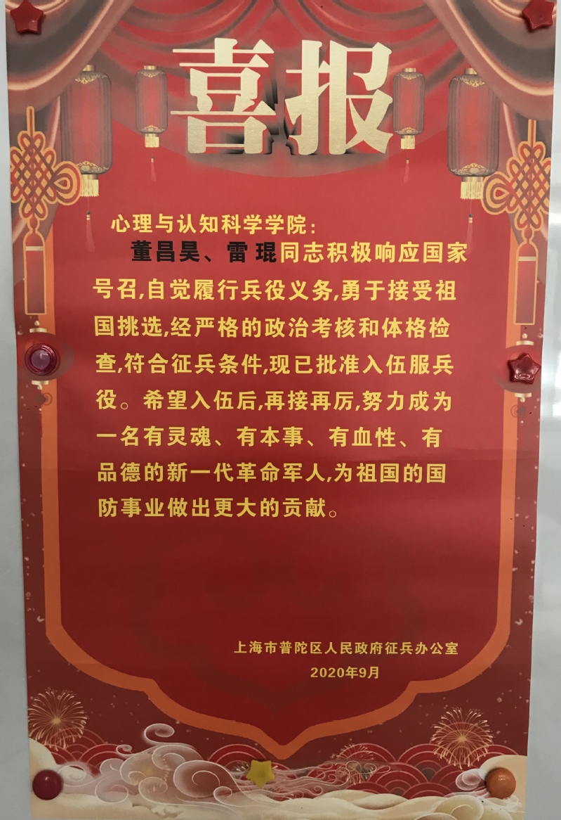 437必赢会员中心2018级心理学大类本科生董昌昊、2019级应用心理学系学术型研究生雷琨积极响应国家号召,自觉履行兵役义务,勇于接受祖国挑选,经过严格的政治考核和体格检查,符合征兵条件,获得批准入伍服兵役。特此祝贺!董昌昊和雷琨董昌昊、陶洁(辅导员)和雷琨