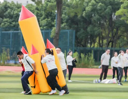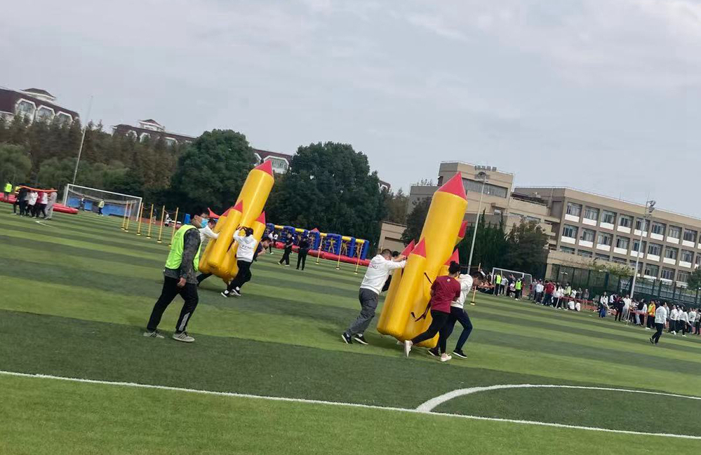 比赛规则:4名队员分别从火箭道具模型的4个面架起火箭,冲向计时点。
