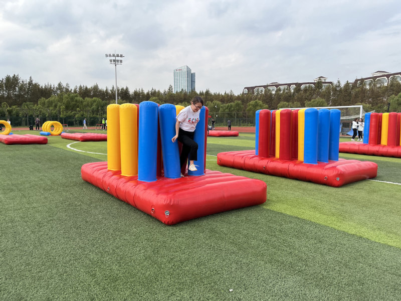 比赛规则:每名队员依次完成丛林漫步、同心圆、人体穿墙和连环洞后返回起点与下一名队员击掌接力,直至最后一名队员返回起点计时结束。