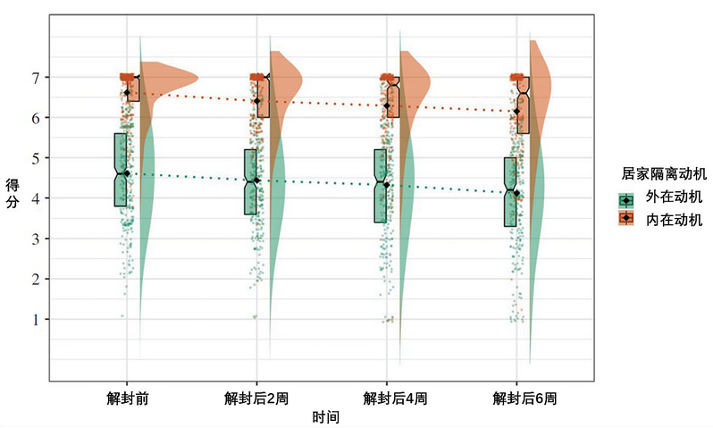 研究结果于20209月发表在Royal Society Open Science(点击此处阅读全文)。该研究发现,解封后,人们的心理健康水平正缓慢的改善,其中一些发现和研究的预期相一致。例如,在解封后,人们仍保持较高的居家隔离动机,但这种高动机更多的是来源于对居家隔离能够保护身体健康的认同,而非由于外界的要求(图1)。
